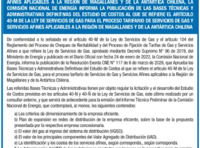 La Comisión Nacional de Energía (CNE) publicó las Bases Técnicas y Administrativas Definitivas del Estudio de Costos para el tercer proceso de fijación de tarifas de los servicios de gas y afines en la Región de Magallanes y la Antártica Chilena, c...